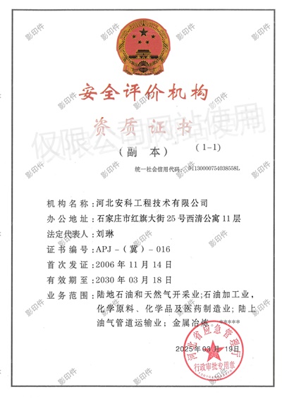 公司具有河北省應(yīng)急管理廳頒發(fā)的安全評(píng)價(jià)機(jī)構(gòu)資質(zhì)證書,可在全國(guó)范圍內(nèi)從事陸地石油和天然氣開采業(yè);石油加工業(yè),化學(xué)原料、化學(xué)品及醫(yī)藥制造業(yè);陸上油氣管道運(yùn)輸業(yè)、金屬冶煉等多種類型企業(yè)的安全評(píng)價(jià)。
