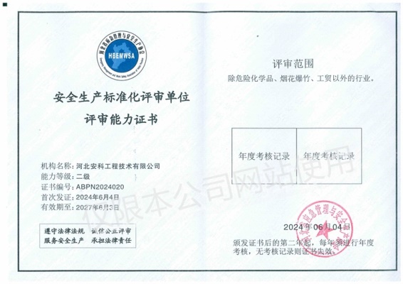 一、河北省應(yīng)急管理與安全生產(chǎn)協(xié)會頒發(fā)的安全生產(chǎn)標(biāo)準(zhǔn)化評審單位評審能力證書